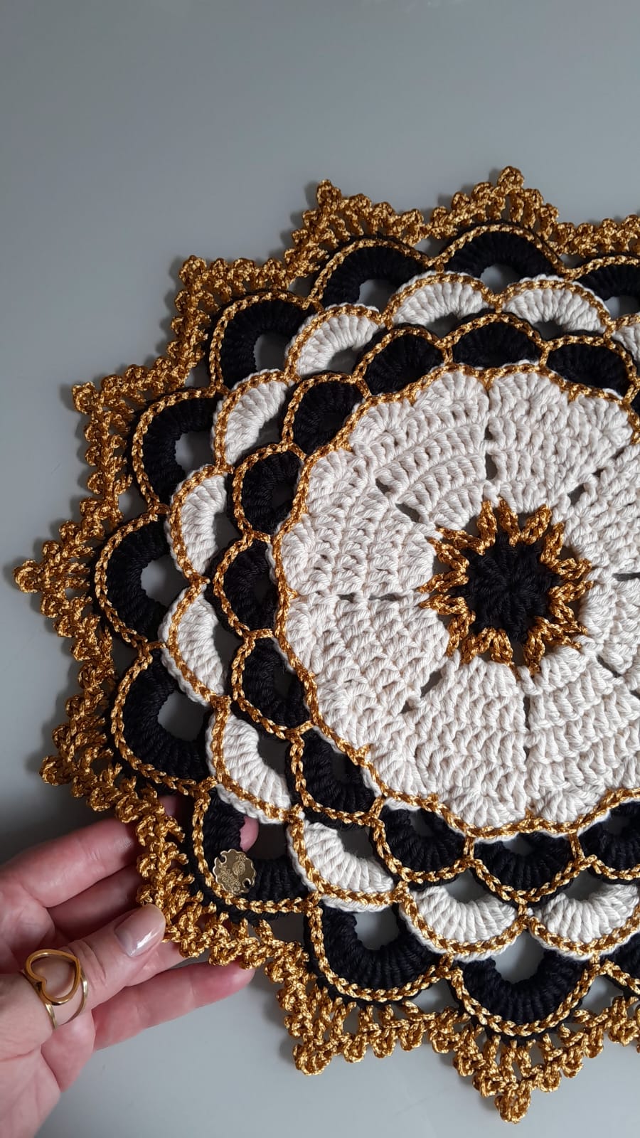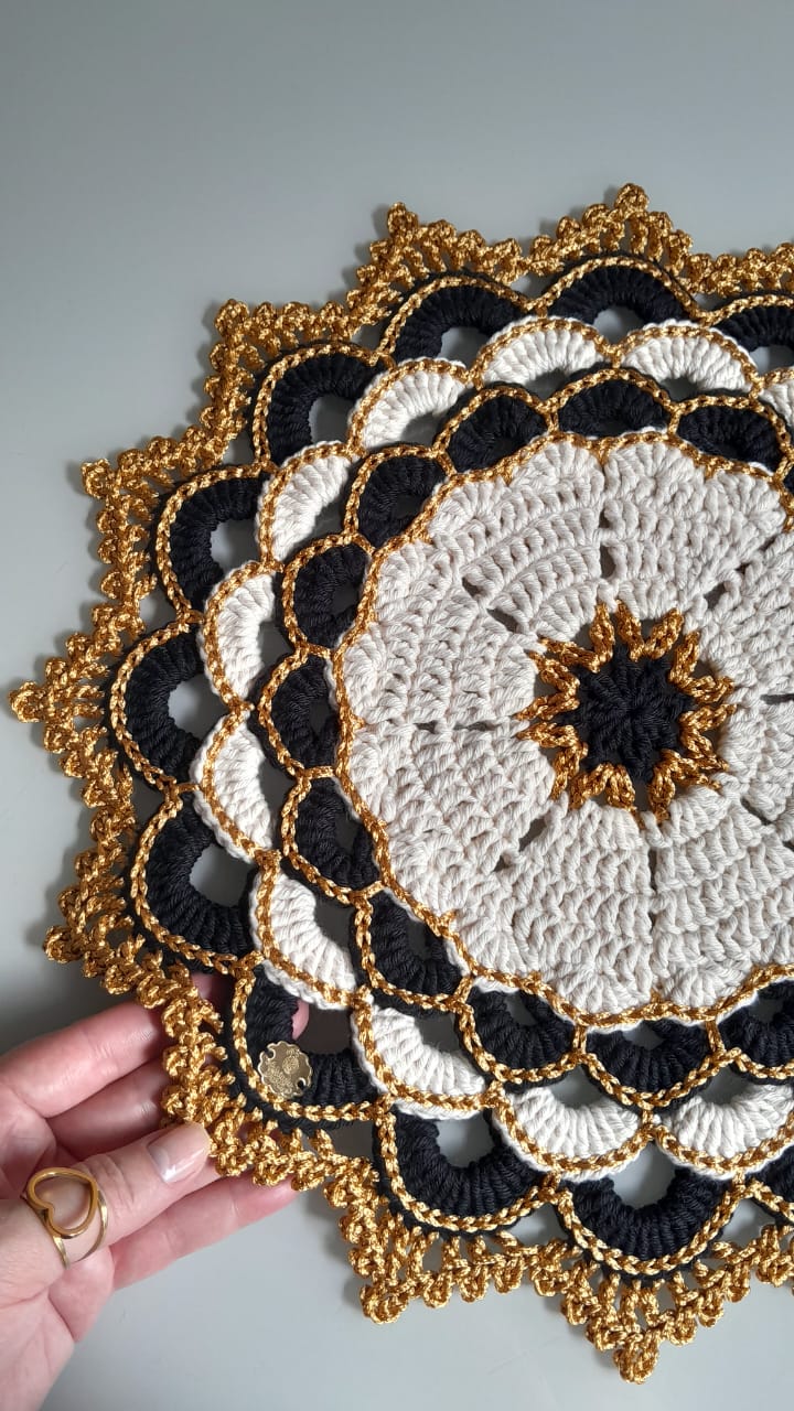 Detalhes e acabamentos no fio Encanto dourado 100% viscose!